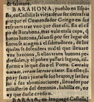 Aparece en la reedición comentada del famoso “Auto de fe de Logroño” celebrado en esta localidad los días 6 y 7 de noviembre de 1610. Escrito en 1811 por Leandro Fernández de Moratín bajo el pseudónimo de Ginés de Posadilla, de esta manera: «Sin corrección ni censura no se adelanta en ninguna facultad y la de la Brujería necesita particular talento, aplicación, edad madura, sumisión y docilidad a los consejos del gran Brujo que dirige el seminario de Barahona». ¿Existió en este pueblo un seminario, liderado por un “Gurú de la brujería”? El dato que se cita en dicha reedición no es para pasar desapercibido…