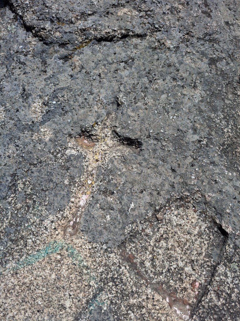 Otra de las marcas que podemos encontrar es una cruz cristiana. Y no tiene más misterio de que fue una forma de señalar como cristianos los lugares “paganos”, donde se rendía un culto ancestral. En algunos lugares se colocaron cruces graníticas (Galicia sería el ejemplo más notable), en otros se construyeron ermitas, … Y si antes comentábamos la probable función de la flecha, la cruz se encuentra justo a unos pocos centímetros de ella. Parece más servir de advertencia, de un aviso, de que ¡ojo!, este lugar ya es cristiano. No es para nada descabellado pensar que este cerrillo (con cantidad de elementos castrenses) fuera lugar de culto, culto a los astros, a los elementos de la naturaleza, o un altar funerario… todo y digo todo son suposiciones, pero hay que recordar que Ya que hemos de recordar que con el distanciamiento del ser humano de su milenial raíz, por el camino, se ha olvidado por completo la sensibilidad para sentir la energía de la naturaleza (y este lugar la tiene)
