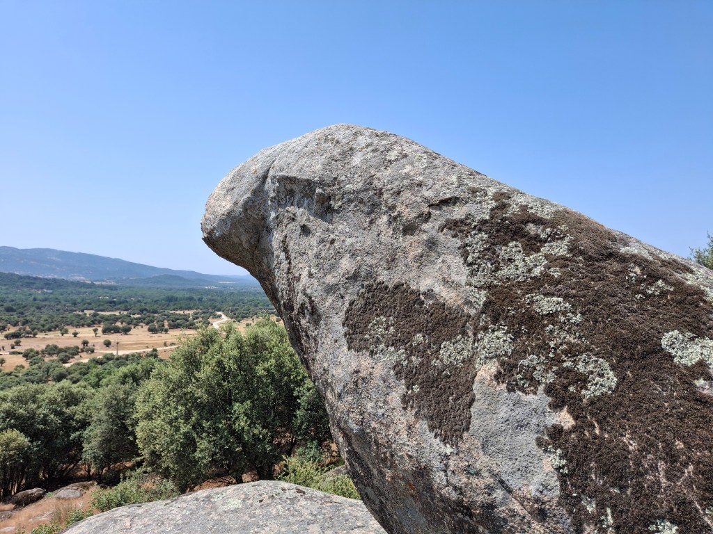 Parece ser que las gallináceas ya entraron en la edad de Hierro en la península y que además de ser alimento, también pudiesen ser adoradas. Pero, según otros historiadores llegaron a ser animal doméstico en el siglo V. Y aquí se genera un vacío de datos, y no es que yo niegue la posibilidad de que se trate de un gallo ( es más, parece ser que el nombre del rio Tiétar, rio que nace en rozas de puerto real y llega hasta Extremadura desembocando en el Tajo y recorriendo todo el valle al que da nombre, pudiera provenir de la palabra proto celta Teter (que designa varias clases de aves (faisán, urogallo, perdiz, tórtola, paloma silvestre)), pero claro, si en esa época no había gallos ni faisanes, la única posibilidad es que en la zona existiera una sub especie de urogallo, que estaría por descubrir, o hacer referencia a la perdiz, o a otra ave que pudiese estar dentro de esta familia. Pero lanzo la posibilidad, por los datos en toponimia que he ido encontrando que pueda más encaminarse hacia el águila, que hacia esta gallinácea. Las referencias en todo el valle y al águila son significativas: Cuevas del cerro del águila y sierras del águila: en Ramacastañas (muy cerca del rio Tiétar), cerro del águila en Pelahustan, arroyo del águila en El Real de san Vicente, peña del águila en santa maría de la alameda (Madrid) y en Tornadizos de Ávila… Lo que me parece curioso es que en un espacio tan cercano existan tantas referencias a esta ave. Existen más cerros del águila, o picos del águila en la península, pero es en esta zona donde se concentran más enclaves y también tiene su lógica, ya que en estos lares la presencia de águila imperial (aquila adalberti) y real (aquila chrysaetos), es significativa. De hecho, es muy común observar parejas de águila imperial merodeando la zona y surcar las alturas a lo largo y ancho del valle, son sin ninguna duda las reinas de sus cielos. Lo que desde mi punto de vista parece estar bastante claro, es que nos encontramos ante la representación de un ave. Y una posible prueba de ello es que en la probable cabeza de pájaro también existe una talla que asemeja un ojo. Talla que podría ser posterior, pero que ahí está.