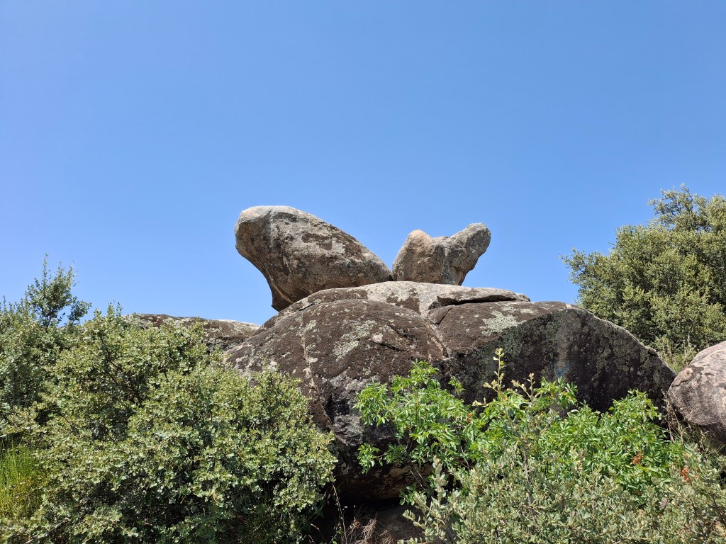 Estas rocas petrozoomorfas que se encuentran en la cima y que aparentan un ave, son las responsables del nombre del lugar. He añadido también el nombre “roca águila” porque en esta modesta investigación he encontrado más similitud con este accipitriforme, que con las gallináceas y voy a explicar la lógica que tiene para mí. Además, habría que tener en consideración al buitre (gipssy gipssy), dado que parece ser que los pueblos indoeuropeos que poblaron la península utilizaban restos fúnebres y empleaban el ritual de abandonar el cadáver para que los buitres devoraran el cuerpo y de esa forma trascendiera el alma del sujeto a los cielos.